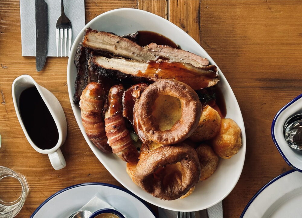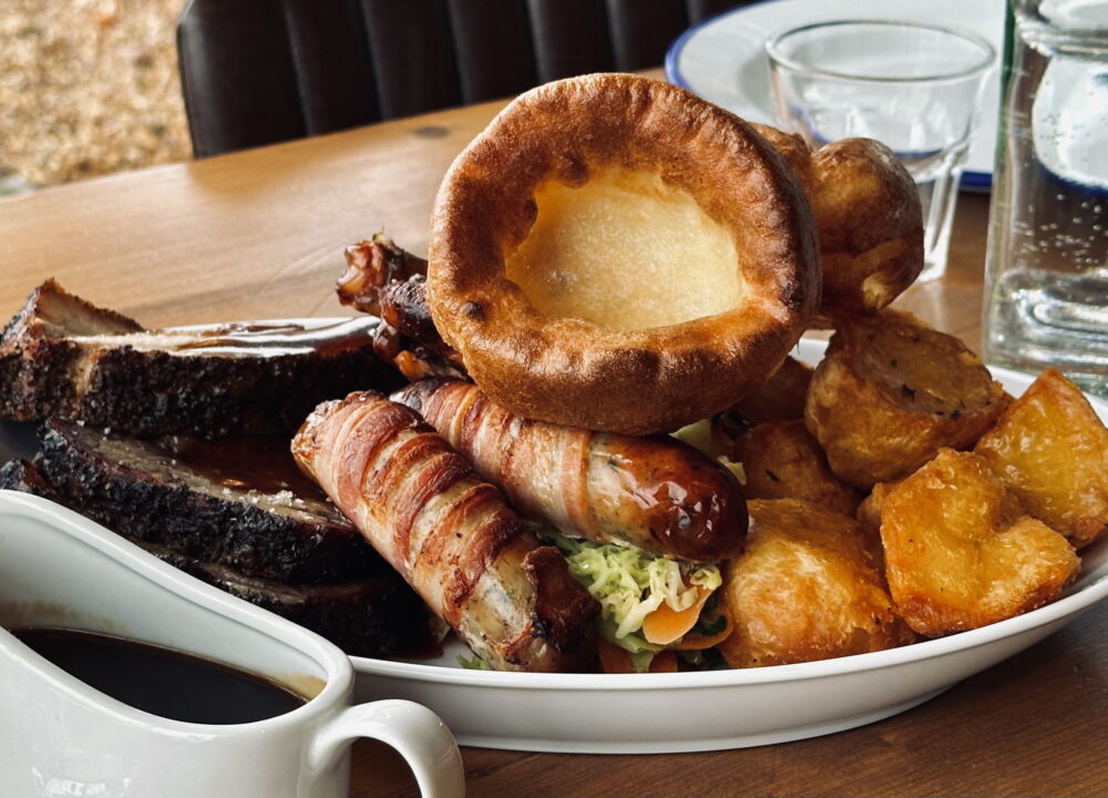 The platter for two features everything you could desire in a smokehouse Sunday Lunch, including smoked beef brisket, pork belly, whole chicken leg, hog in blankets, and all the traditional roast trimmings.